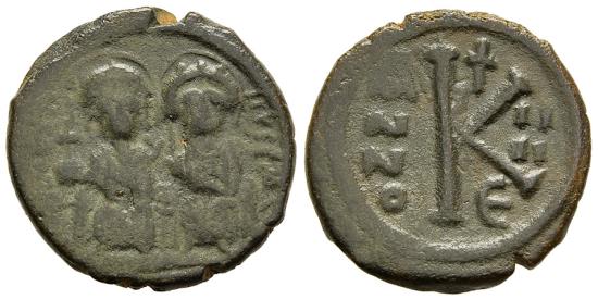 Byzantine Empire Justin II and Sophia, 15 November 565 - 5 October 578 A.D. BZ116880. Bronze half follis, DOC II-1 47d, Wroth BMC 88, Tolstoi 222, Hahn MIB III 44a, Sommer 5.13, SBCV 361, Morrisson BnF -, Ratto -, aF, well centered on a broad flan, green patina, 4.935g, 20.8mm, 180o, Constantinople (Istanbul, Turkey) mint, D N IVSTINVS P P AV (Latin: Dominus Noster Justinus Per Petuus Augustus - Our lord, Justin, perpetual emperor), Justin II (on left) and Sophia (on right) seated side-by-side facing on a double throne, both are nimbate, he holds a globus cruciger, she holds a cruciform scepter; reverse large K (20 nummi) between ANNO and II/II (year 4), cross above, E (5th officina) below In 569, the Lombards under Alboin invaded northern Italy. |