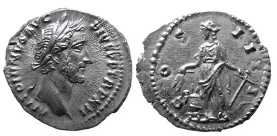 PCW-R5481-ROMAN EMPIRE, Antoninus Pius. 137-161 AD. AR Denarius (3.40 gm; 19 mm). Rome, 148-149 AD. ANTONINVS AVG PIVS P P TR P XII, laureate head right / COS IIII, Salus standing facing, head left, holding patera & rudder on globe, feeding a serpent entwined around altar. RIC 162; RSC 281. Sharply struck on a good metal. Nicely centered. High relief with great details. Choice FDC. Lightly toned. |