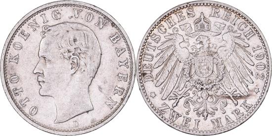 | | German States, BAVARIA, Otto, 2 Mark, 1902, Munich, Silver, , KM:913 | | | Head left, Crowned imperial German eagle, Open and closed curl varieties exist. Prev. KM#511. Varieites exist, OTTO KOENIG VON BAYERN | | FEATURES |