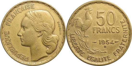 | | France, 50 Francs, Guiraud, 1954, Beaumont le Roger, Cupro-Aluminium, | | | Head of Marianne to the left, wearing an olive wreath adorned with a cockade., Rooster and laurel branch to left of denomination, date and mint letter, French motto below. | | FEATURES |