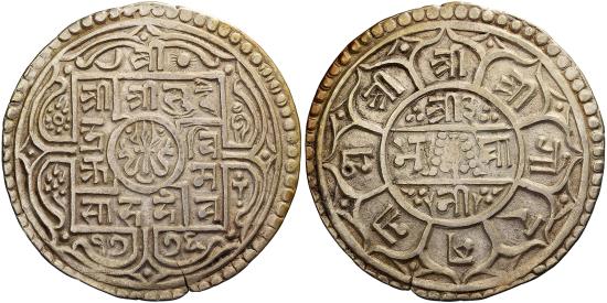 | | Nepal, Surendra Vikrama, 1 Mohar, 1776 (1854), Silver, , KM:602 | | | Year 1776 of the Saka Era = year 1854 of the Gregorian calendar. | | FEATURES |