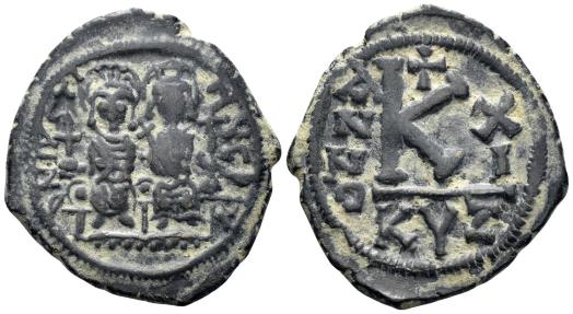 Justin II, with Sophia. 565-578. AE Half Follis (5.99g, 25mm). Cyzicus mint. Dated RY 11 (575/6 AD). Obv.: DN IVSIN VS PPAVI, Justin and Sophia, both nimbate, seated facing; cross above. Rev.: large K; cross above, X / I across field; KYZ in exergue. DOC 133; MIBE 50b; SB 373. VF.