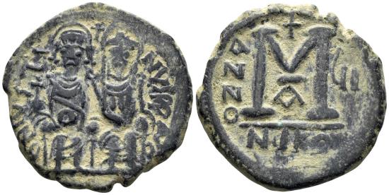 Justin II and Sophia. 565-578. AE Follis (13.18g, 30mm). Nicomedia mint. Dated RY 6 (570/1). Obv.: D N IVSTINVS PP V, Justin II and Sophia enthroned facing, emperor holding globus cruciger, empress cruciform scepter. Rev.: large M; cross above, ANNO to left to right, ЧI to right; A below; NIKO in exergue. DOC 94a; SB 369. Deposits, VF.