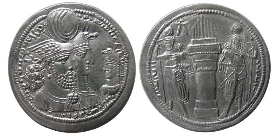 | PCW-S1979-SASANIAN KINGS, Vahram (Bahram) II and family. 276-293 AD. AR Drachm (4.41 gm; 28 mm). Jugate busts of Bahram, wearing winged crown with korymbos, and his queen, wearing kolah with boar’s head, right, vis-a-vis bust of Prince 4, wearing kolah with eagle’s head, reverse, fire altar with attendants, with symbol “Faravahar” on the left of flame. SNS type VI/1 var.; Gobl type VII/2a; Saeedi 166 corr. (rev. type); Sunrise 786. Lovely style. Sharply struck on a nice full broad flan. Choice FDC. Lightly toned with some luster. Great example for the issue. |