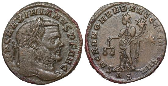 IMP C MAXIMIANVS P F AVG; laureate head right; slight drapery on left shoulder