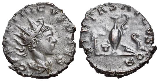 | Tetricus II (Caesar, 273-274). Æ Radiate. Treveri, 272-3. R/ Pontifical instruments: sprinkler, simpulum, jug, and lituus |