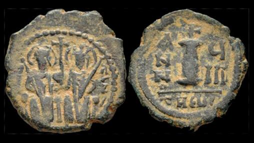 obv: nimbate figures of Justin II and Sophia seated facing on throne, each holding cruciform scepter and resting hand on globe surmounted by long cross between