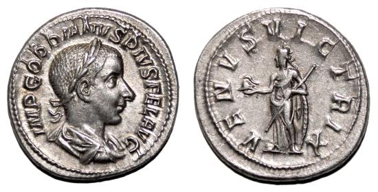 Obverse: IMP GORDIANVS PIVS FEL AVG. Laureate, draped and cuirassed bust to right. Reverse: VENVS VICTRIX. Venus standing facing, head to left, holding helmet and sceptre, leaning on shield. Superb denarius, very little circullated, in EF+/EF condition, conserving full details on both sides, including a precious bust of Gordian III on obverse. Besides it´s a heavy and large specimen: 3,9 g - 20 mm. RIC 131. Rome mint, AD 241. 3,9 g - 20 mm -------------------------------------------------------------------------------------------------- Visit our site about Numismatics and Archaeology: aeternitas-numismatics.com |