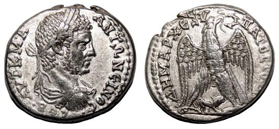 Obverse: AΥT K M A ANTΩNEINOC CEB. Laureate, draped and cuirassed bust right seen from behind. Reverse: ΔΗΜΑΡX ΕX ΥΠΑΤΟC ΤΟ Δ. Eagle standing facing, head right; six-pointed star between legs, lion walking right below. Precious coin, in EF condition, conserving full details on both sides, very bold reliefs checkable at photo and quality silver, much better than usual in these issues. Scarce issue: only FOUR specimens known by M. Prieur. Prieur 1197. Heliopolis mint, AD 215-217. 11,8 g - 27 mm ------------------------------------------------------------------------------------------------- Visit our site about Numismatics and Archaeology: aeternitas-numismatics.com |