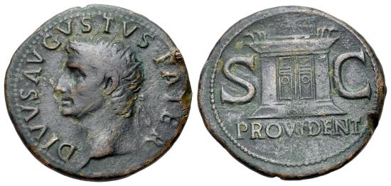 Divus Augustus (Died AD 14). Æ As (29mm, 10.64 g, 6h). Rome mint. Struck under Tiberius, circa AD 22-30. DIVVS AVGVSTVS PATER, radiate head of left R/ PROVIDENT in exergue, S C across field, ornate altar enclosure with double paneled door. RIC I 81 (Tiberius); BMCRE 146 (Tiberius); Cohen 228. Good VF, green-brown patina.