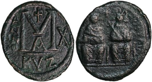 Follis dated 574/75 AD, struck under Emperor Justin II. Cyzicus mint. Fine condition. SB 372 (Cyzicus). 9,29 g. Protocol no. 5698