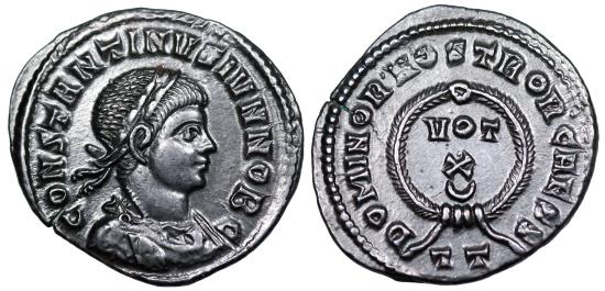 Constantine II A.D. 322- 325 Ӕ nummus 18x20mm 2.6g CONSTANTINVS IVN NOB C; Laureate, draped and cuirassed bust right. DOMINOR NOSTROR CAESS surrounding laurel wreath enclosing VOT X crescent in three lines. in ex. TT RIC VII Ticinum 172