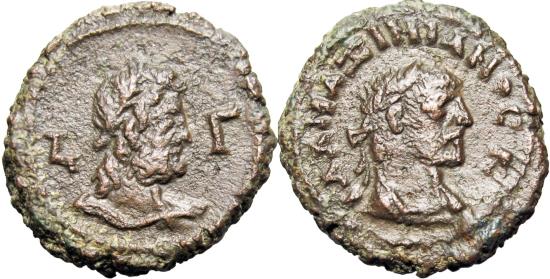 EGYPT, Alexandria. Galerius. As Caesar, AD 293-305. Potin Tetradrachm (20mm,6.97 g, 12h). Dated RY 3 (AD 294/5). Laureate and cuirassed bust right, seen from the front / Bust of Zeus right, wearing taenia, drapery on left shoulder; L Γ (date) across field. Köln –; Dattari (Savio) –; K&G –; RPC X Online 76117; Emmett 4240.3 (R5). Brown patina, light roughness, Good VF. Extremely Rare. Just two example offer of this type. Example sold in the archive coins for $800 in better condition !! |