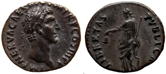 IMP NERVA CAES AVG – P M TR P COS III P P Laureate head r. Rev. LIBERTAS – PVBLICA Libertas standing l., holding pileus in r. hand and sceptre in l.