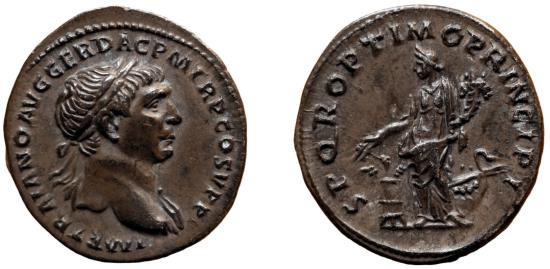 IMP TRAIANO AVG GER DAC P M TR P COS V P P Laureate bust r. with aegis. Rev. S P Q R OPTIMO PRINCIPI Annona standing l. holding cornucopia and corn ear over modius; behind her, garlanded prow of ship.