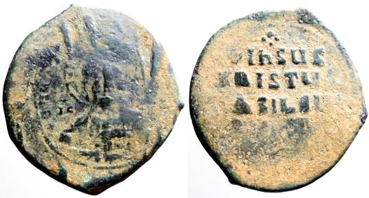 Rev: + IҺSЧS/ XRISTЧS/ ЬASILЄЧ/ ЬASILЄ; in four lines; ornament above and below.