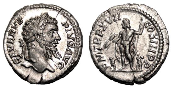 Obverse: SEVERVS PIVS AVG. Laureate head right. Reverse: P M TR P XVII COS III P P. Jupiter standing left, holding thunderbolt in right hand and sceptre in left; by him two children standing to left and right. Excellent denarius, very little circullated, in EF condition, conserving full details on both sides, including a precious portrait of Septimius Severus on obverse. High quality silver with its original luster well preserved. RIC 226. Rome mint, AD 209. 3,3 g - 19 mm ------------------------------------------------------------------------------------------------- Visit our site about Numismatics and Archaeology: aeternitas-numismatics.com |