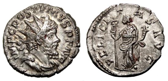 Obverse: IMP C POSTVMVS P F AVG. Radiate, draped and cuirassed bust to right. Reverse: FELICITAS AVG. Felicitas standing to left, holding caduceus and cornucopiae. Very nice coin, in EF- condition, conserving complete details on both sides and bold reliefs checkable at photo. Silver alloy richer than usual in these issues. RIC 58 (Lugdunum). Treveri mint, AD 263-265. 3,5 g - 21 mm ------------------------------------------------------------------------------------------------- Visit our site about Numismatics and Archaeology: aeternitas-numismatics.com |