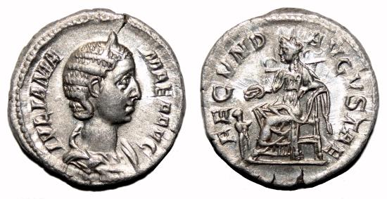 Obverse: IVLIA MAMAEA AVG. Diademed and draped bust right. Reverse: FECVND AVGVSTAE. Fecunditas standing left, holding cornucopiae and extending right hand over child before her. Excellent denarius, very little circullated, in EF condition, conserving full details on both sides, very bold reliefs and good quality silver. Besides the coin looks much better in the hand than in the photo. RIC 332. Rome mint, AD 232. 3,2 g - 19 mm ------------------------------------------------------------------------------------------------- Visit our site about Numismatics and Archaeology: aeternitas-numismatics.com |