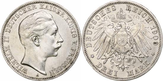 | | Kingdom of Prussia, Wilhelm II, 3 Mark, 1909, Berlin, Silver, , KM:527 | | | Cleaned. | | FEATURES |
