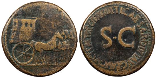 AE Sestertius 27.59g. 34mm. 36-37 A.D. Rome Mint Empty horse-drawn quadriga r., its side ornamented with trophy, captive seated l., Victory standing r. erecting trophy, and wreath. Large S.C at center. TI CAESAR DIVI AVG F AVGVST P M TR POT XXXIIX RIC I 66 Dark brassy brown patina. Some minor porosity. Some faint marks on obverse. Edge has been lightly filed at one time. Tiny test mark on reverse. ex. Justice Frederic Rockwell Sanborn, sold in February 1977 by Sotheby-Parke-Bernet, lot 181, with envelope and Sanborn's round handwritten ticket.