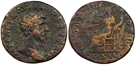 AE Dupondius 10.24g. 25mm. 162-163 A.D. Rome Mint Radiate, draped and cuirassed bust, r. IMP CAES L AVREL VERVS AVG Fortuna seated l., holding cornucopiae, r. hand on rudder; S-C to either side; In ex.: COS II FORT RED TR POT III RIC III 1341 var. (bust type) Scarce. Brown patina with some brassy areas. Moderate roughness and corrosion.