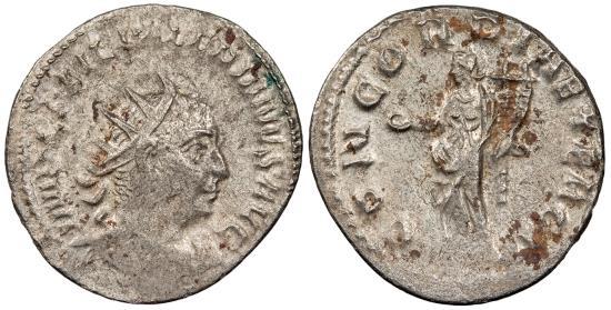Bi Antoninianus 2.99g. 22mm. 254 A.D. Rome or Viminacium Mint Radiate, draped and cuirassed bust, r. IMP C P LIC VALERIANVS AVG Concordia standing l., holding patera and double cornucopiae. CONCORDIA EXERCIT RIC V 81; RSC IV 39 Rare reverse legend variety. Toned and lustrous. Unevenly struck. Porous, as typical. Some rusty adhesions.