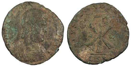 AE1 7.00g. 26mm. 353 A.D. Lugdunum Mint Bare-headed and cuirassed bust, r. D N DECENTI-VS NOB CAES Larg chi-rho flanked by alpha and omega; In ex.: LSLG SALVS DD NN AVG ET CAES RIC VIII 155 Mottled green patina. Clear christogram, despite issues. Moderate roughness with some light marks. Obverse legends weak.