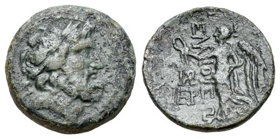 Cilicia, Elaioussa Sebaste, c. 1st century BC. Æ (21,2mm, 7g). Laureate head of Zeus r. R/ Nike advancing left, holding wreath and palm frond; to left, monogram above EP. Ziegler 564-5; SNG BN 1142-7; SNG Levante 830. Green patina. VF