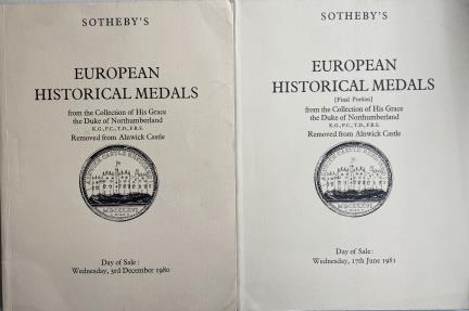 Sotheby's. - Complete set of: European Historical Medals from the Collection of His Grace the Duke of Northumberland. Removed from Alnwick Castle. London, 3 December 1980. Card cover, 464 lots, 62 b&w plates. list of estimates and realized prices. European Historical Medals (Final Portion) from the Collection of His Grace the Duke of Northumberland. Removed from Alnwick Castle. London 17 June 1981. Card cover, 471 lots, 51 b&w plates. list of estimates. 2 catalogues, Complete set. Very good