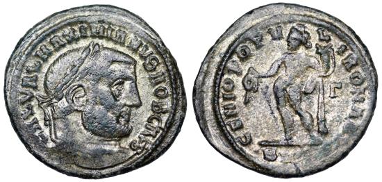 Galerius A.D. 304- 305 Ӕ follis 27x29mm 9.7g GAL VAL MAXIMIANVS NOB CAES; laureate head right. GENIO POPVLI ROMANI; Genius standing left, head towered, loins draped, holding patera & cornucopiae; Γ in right. In ex. •SM•SD• RIC VI Serdica 4b