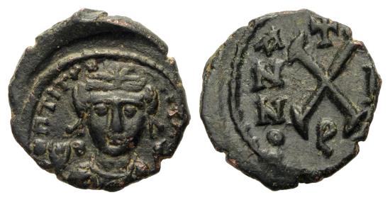 Av: Crowned bust facing, wearing consular robes, holding mappa and eagle-tipped sceptre. Rv: Value mark X, cross above, regnal year to right, R below.