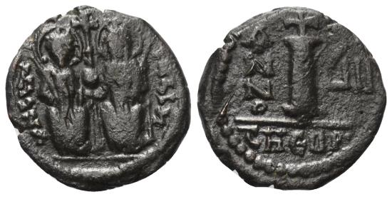 Av: Justin and Sophia enthroned facing, holding between them a long cross on globus. Rv: Value mark I between ANNO and year, cross above; THEUP in the field.