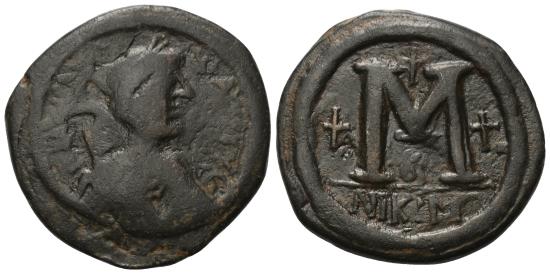 Av: DN IVSTINI – ANVS PP AVC. Bust of the emperor in cuirass, paludamentum, and diadem, facing right. Rv: Value mark large M, cross above and in the fields, B below; NIKM in exergue. 32 mm, 16.34 g. Sear 199; DOC 110; MIBE 105; Sommer 4.63. Very fine.