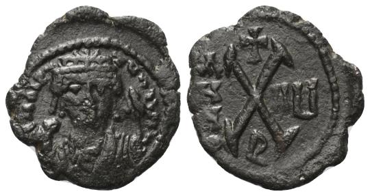 Av: Crowned bust in consular robes, holding mappa and eagle scepter, facing. Rv: Value mark X, cross above, IIU at right, R below.