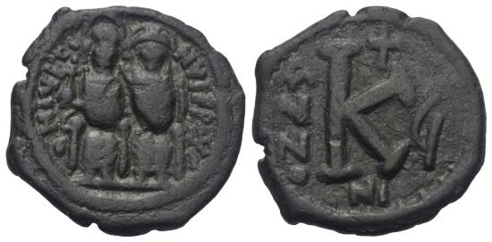 Av: Justin and Sophia enthroned facing, holding between them a long cross on globus, with cross above between them. Rv: Value mark K between ANNO and X, cross above; KYZ in exergue.