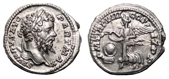 Obverse: SEVERVS AVG PART MAX. Laureate head right. Reverse: P M TR P VIII COS II P P. Victory advancing left, holding open wreath over shield set on low base. Very nice denarius, in EF/EF- condition, conserving complete details on both sides, including a precious portrait of the emperor on obverse. RIC 150. Rome mint, AD 200. 3,4 g - 19 mm -------------------------------------------------------------------------------------------------- Visit our site about Numismatics and Archaeology: aeternitas-numismatics.com |