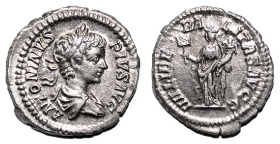 Obverse: ANTONINVS PIVS AVG. Laureate and draped bust right. Reverse: LIBERALITAS AVGG IIII. Liberalitas standing left, holding abacus and cornucopiae. Very good denarius, close to EF condition, conserving full details on both sides and very bold reliefs checkable at photo. RIC 135. Rome mint, AD 204. 3 g - 19 mm -------------------------------------------------------------------------------------------------- Visit our site about Numismatics and Archaeology: aeternitas-numismatics.com |