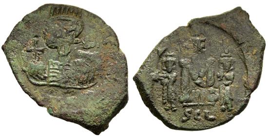 Byzantine Empire, Constantine IV, 15 July 668 - 10 July 685 A.D. BZ117403. Bronze follis, DOC II-2 60, Anastasi 220, Wroth BMC 61, Tolstoi 78, Ratto 1663, Morrisson BnF 14/Sy/AE/01, Hahn MIB 104, Sommer 13.28, SBCV 1207, aVF, green patina, overstruck on a cut older coin, 5.964g, 29.1mm, 180 o, Sicily, Syracuse mint, diademed, helmeted, and cuirassed bust facing, beardless, globus cruciger in right hand; reverse M between Heraclius (on left) and Tiberius, each stands facing wearing a crown with cross and chlamys, each holds globus cruciger, SLC below  above, SCL in exergue ; scarce Constantine IV, Pogonatus should be credited with saving Europe from Muslim conquest. The great siege of Constantinople by the caliph Muawiyah I, beginning in 674, lasted four years. The newly invented 'Greek Fire' made the city impregnable. |