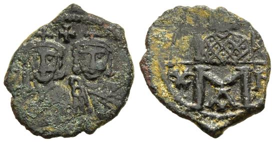 Byzantine Empire, Constantine V and Leo IV, joint reign 6 June 751 - 14 September 775 A.D. BZ117410. Bronze follis, DOC III-1 11, Wroth BMC 23, Morrisson BnF 23/Cp/AE/02, Tolstoi 54, Ratto 1754, SBCV 1556, Sommer 23.5, aVF, green patina, light earthen deposits, tight flan, ragged edge, 2.022g, 17.5mm, 180o, Constantinople (Istanbul, Turkey) mint, facing busts of Constantine V (on left) and Leo IV (on right), both wear crown with cross and chlamys, cross between their heads; reverse facing bust of Leo III with short beard, wearing crown and loros, holding cross potent, cross right, all above horizontal line; below line large M (40 nummi), X left, N right, A below ; very scarce