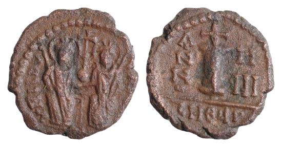 Justin II. 565-578. Æ Decanummium (19mm, 3.2 g). Theoupolis (Antioch) mint. Dated RY 5 (569/70). Justin and Sophia enthroned facing, holding cross on globe between them / Large I;