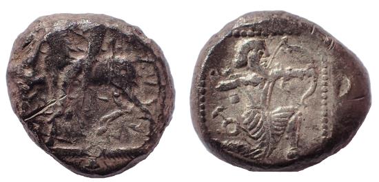 The Archer on the reverse is wearing different attire from the typical issues of this stater from Tarsos and may represent one of the late Cilician kings, such as Syennesis III.