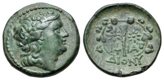 MOESIA, Dionysopolis. 3rd century BC. Æ (21mm, 5.92g,12h). Iphia–, magistrate. Wreathed head of Dionysos right R/ Club; stars and IΦ-IA flanking; all within wreath, DIONY below. AMNG I 368; HGC 3.2, 1773. Lovely green patina, Good VF