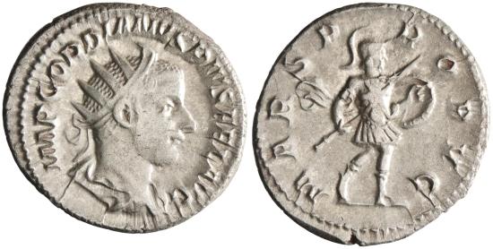 | Roman: Gordian III (238-244), silver antoninianus (4.89g), Rome mint, 238-244 CE. Radiate, draped, and cuirassed bust right / Mars walking right, holding shield and spear. |