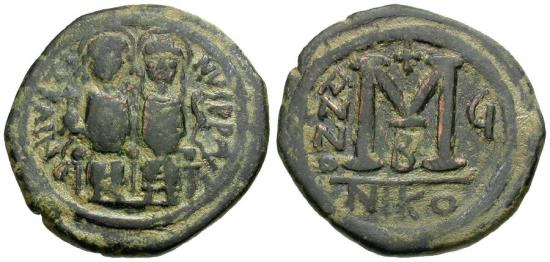 Nimbate figures of Justin and Sophia seated facing, with Justin holding globus cruciger, and Sophia holding scepter