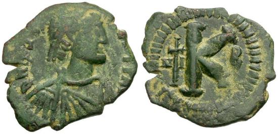 Title: *Sear 90* Byzantine Empire. Justin I (AD 518-527) Æ Half Follis