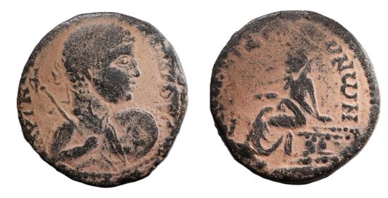 Mesopotamia. Edessa. Severus Alexander (22-235 AD). AE 24 mm. 10.4 gm. Obv.: ΑΥΤ Κ Μ Α ϹΕΥΗ ΑΛΕΞΑΝΔΡΟϹ Ϲ; laureate, draped and cuirassed half-length bust of Severus Alexander, right, holding eagle-tipped sceptre on shoulder and decorated shield, seen from front. Rev.: ΜΗΤ ΚΟ ΕΔΕϹϹΗΝωΝ; Tyche of the City seated on basis, left, holding corn ears; at her feet, lighted altar; below, river god swimming, left. RPC VI 7803 (temporary) Rare.