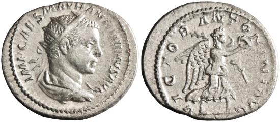 | Roman: Elagabalus (218-222), silver antoninianus (4.80g), Rome mint, 218-222 CE. Radiate, draped, and cuirassed bust / Victory walking right, holding wreath and palm branch. |