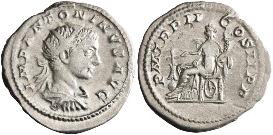 | Roman: Elagabalus (218-222), silver antoninianus (4.95g), Rome mint, 219 CE. Radiate, draped, and cuirassed bust / Fortuna seated left holding rudder and cornucopiae, wheel under chair. |