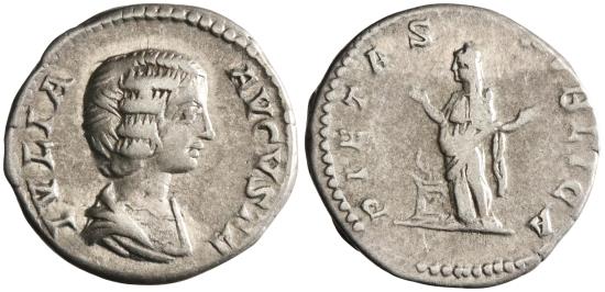Roman: Julia Domna (193-217), silver denarius (3.09g), Rome mint, 193-217 CE. Draped bust right / Pietas standing left, raising both hands at altar.